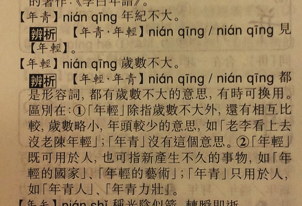 是的,《辭海》沒收「年青」與「年輕」辭條;《中華大辭典》也沒有;而台灣教育部重編的《國語辭典修訂本》,則只有「年輕」一條而無「年青」。然而,請看現今放諸各大圖書館的大部份辭典,均有收入「年青」一條,可見編辭典的人還是公平的,還是會考慮歷史、習慣以及其他各方面因素而不是胡塗動刀,亂以「規範」之名而與歷史、社會和文化切割的。筆者又參考了現在香港書局售賣的三部具代表性的辭典,也發現「年青」、「年輕」並存,而且編者還細心地作出辨識: